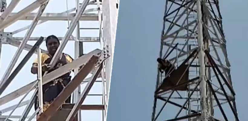 கரூர் ; கரூரில் 4 மணி நேரத்திற்கு மேலாக 120 அடி உயர செல்போன் டவரில் ஏறி பெண்மணி ஒருவர் போராட்டத்தில் ஈடுபட்டதால் பரபரப்பு ஏற்பட்டது.