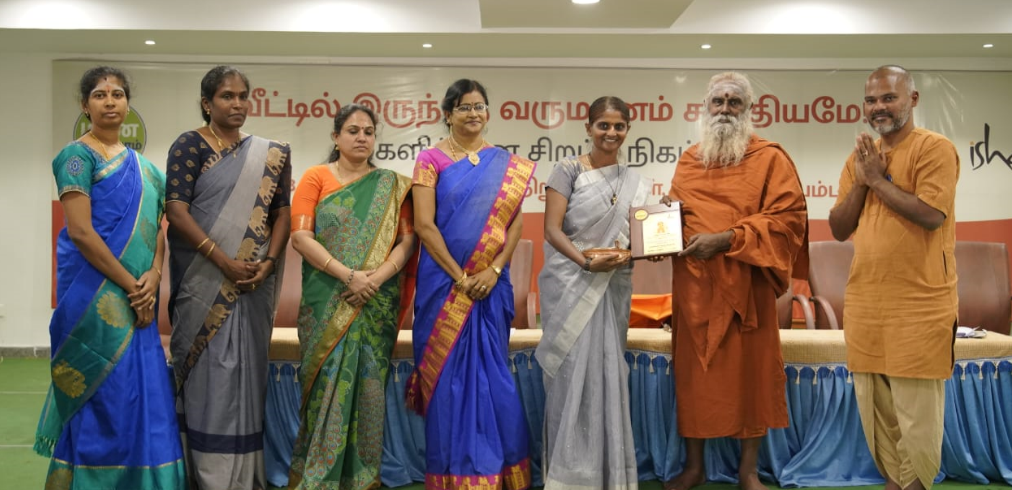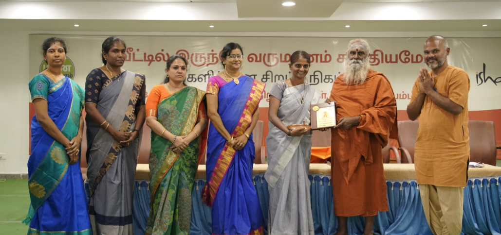 உலக மகளிர் தின சிறப்பு நிகழ்ச்சியாக ஈஷாவின் மண் காப்போம் இயக்கம் சார்பாக கோவை பேரூர் தமிழ்க்கல்லூரியில் இன்று (8 மார்ச்) நடந்த ‘வீட்டிலிருந்தே வருமானம் சாத்தியமே’ என்ற நிகழ்ச்சியில் 250-க்கும் மேற்பட்ட பெண்கள் கலந்துகொண்டனர்.