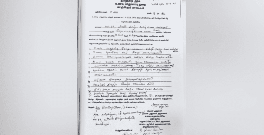 அதனைத் தொடர்ந்து, உணவு பாதுகாப்பு மற்றும் தரங்கள் சட்டம் 2006 பிரிவு 26, 27 ,31, 36, 56 மற்றும் 55 கீழ் ஸ்ரீ பாலா உணவகத்தில் உணவு விற்பனை செய்ய தடை விதிக்கப்பட்டு நோட்டீஸ் விநியோகிக்கப்பட்டது. மேலும், உணவகத்தில் அதிகமான பிளாஸ்டிக் பொருட்கள் பயன்படுத்திய காரணத்தினால் 2000 ஆயிரம் ரூபாய் அபராதம் விதிக்கப்பட்டுள்ளது.