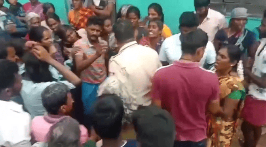 தர்மபுரி மாவட்டம் அரூர் அருகே உள்ள பெத்தூரில் அரசு நூலக கட்டிடம் கட்டும் பணி கடந்த சில நாட்களாக நடந்து வருகிறது. இந்த கட்டிட பணிக்காக கம்பைநல்லூர் அருகே கோணம்பட்டி கிராமத்தை சார்ந்த எல்லப்பன், முருகன் உள்ளிட்ட மூன்று கட்டிட தொழிலாளர்கள் தங்களது சமுதாய அடையாளம் பொருந்திய ஆடை அணிந்து வேலைக்கு வந்துள்ளனர்.