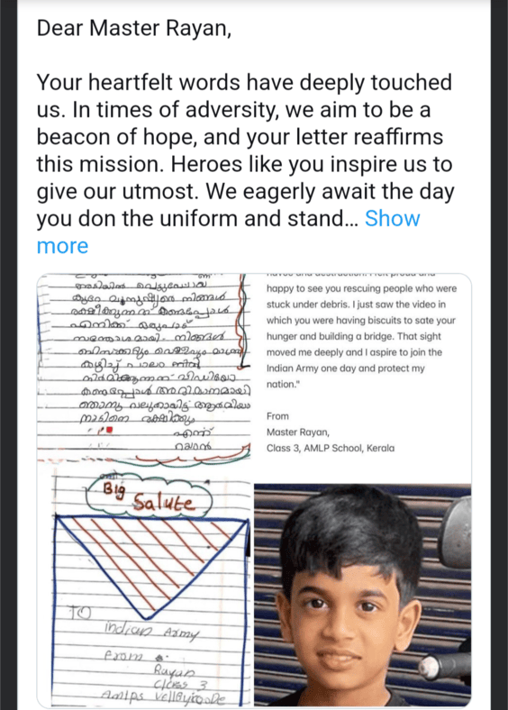 அந்த கடிதத்தில் அன்புள்ள இந்திய ராணுவமே எனது அன்பிற்குரிய வயநாடு ஒரு பெரிய நிலச்சரிவினால் தாக்கப்பட்டு அழிவை சந்தித்துள்ளது. இடுபாடுகளில் சிக்கியவர்களை நீங்கள் காப்பாற்றுவதை பார்த்து நான் பெருமையாகவும் மகிழ்ச்சியாகவும் உணர்ந்தேன்.மேலும் 2018 ஆம் ஆண்டு கேரளாவில் ஏற்பட்ட வெள்ளத்தை விடவும் மலைபாங்கான கிராமப்புறங்களை உள்ளடக்கிய தேயிலை தோட்டங்களுக்கு புகழ்பெற்ற வயநாட்டில் ஏற்பட்ட நிலச்சரிவுகள் மிகவும் மோசமானது ராணுவ வீரர்களின் சேவையால் நான் கவரப்பட்டேன். உங்களைப்போலவே ராணுவத்தில் நானும் சோல்ஜர் ஆக இணைந்து பணியாற்ற வேண்டும் என்று அந்த கடிதத்தில் எழுதியிருந்தார்.அதற்கு பதில் அளித்த ராணுவம்…