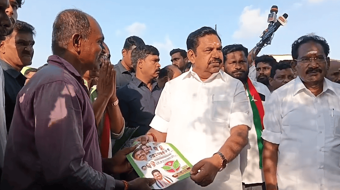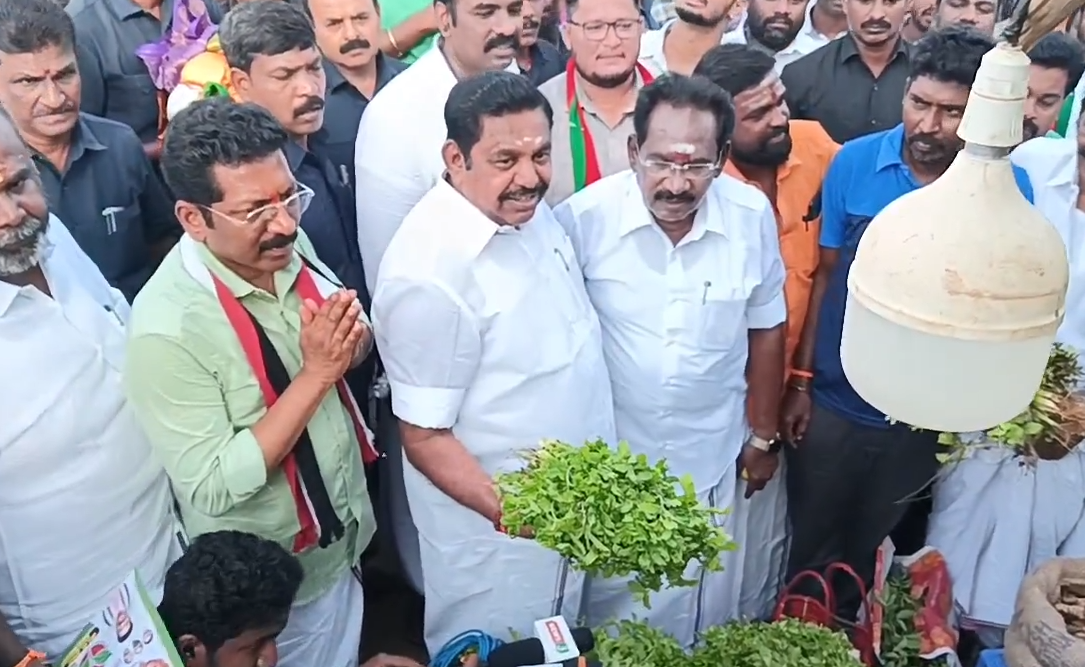 மதுரை அதிமுக வேட்பாளர் டாக்டர் சரவணனுக்காக அக்கட்சியின் பொது செயலாளர் எடப்பாடி பழனிச்சாமி மாட்டுத்தாவணி காய்கறி, பழ சந்தைகளில் வியாபாரிகளிடம் துண்டு பிரசுரம் கொடுத்து வாக்கு சேகரிப்பில் ஈடுபட்டார்.