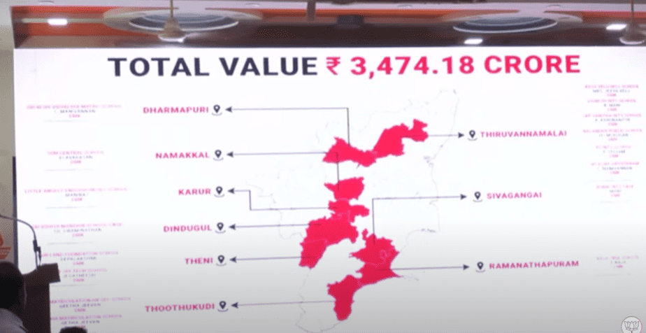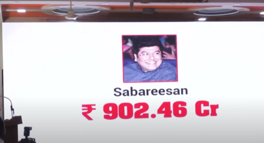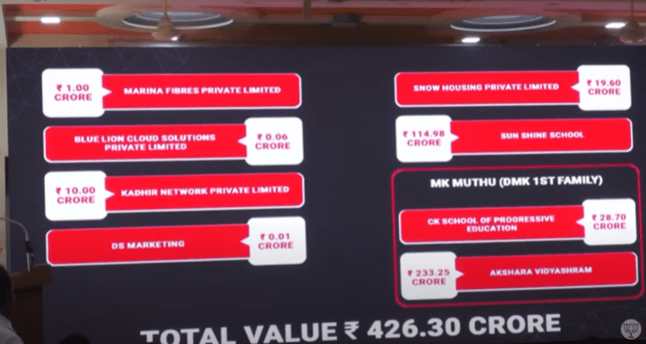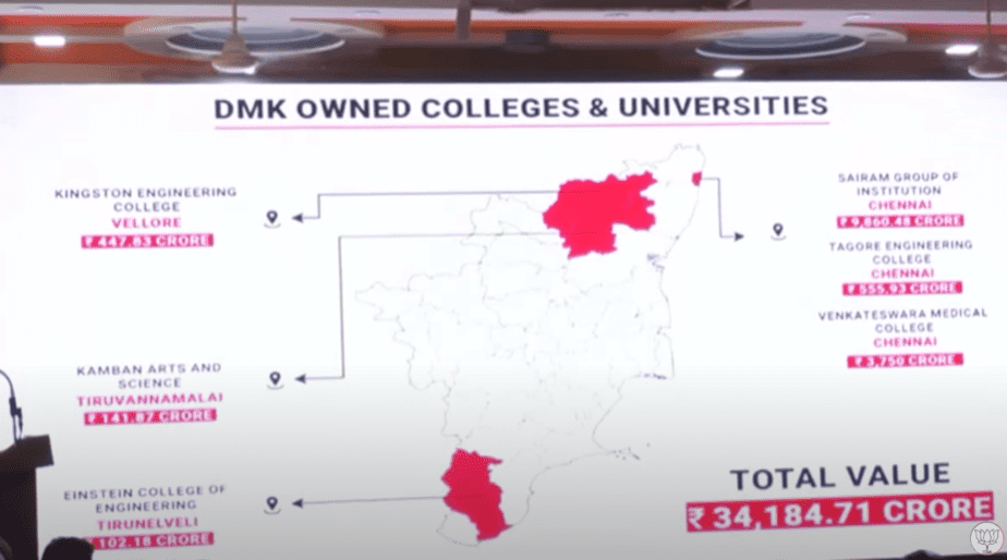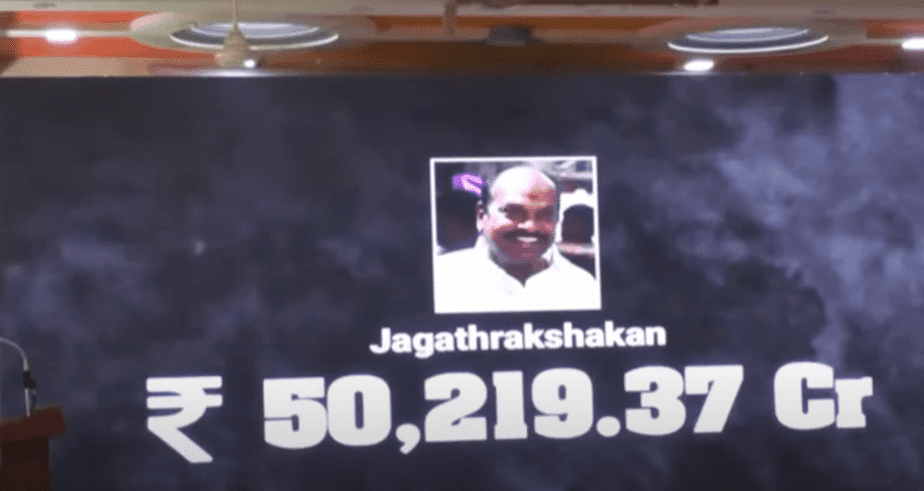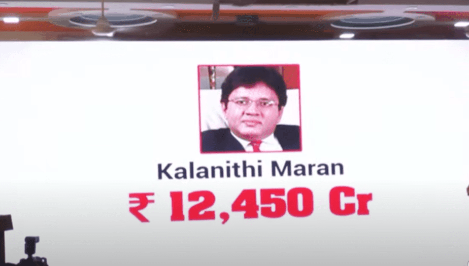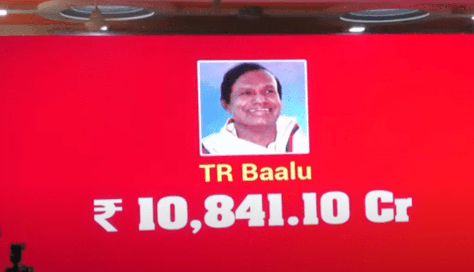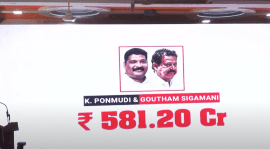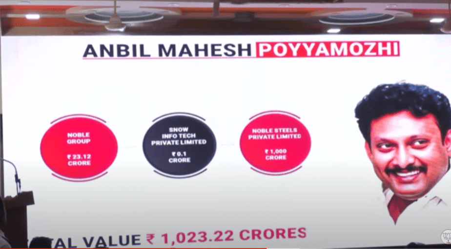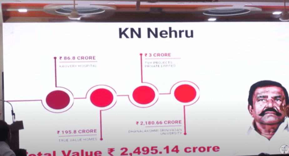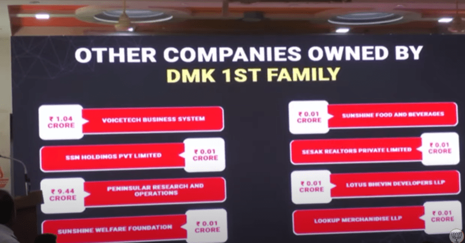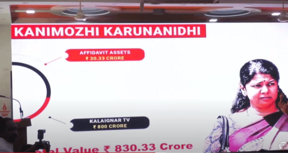 இதைத் தொடர்ந்து, திரையில் திமுக எம்பிக்கள் ஜெகத்ரட்சகன்,டிஆர் பாலு, கனிமொழி, அமைச்சர்கள் எ.வ. வேலு, கேஎன் நேரு, முதலமைச்சர் ஸ்டாலின் உள்ளிட்டோரின் சொத்து விபரங்களை அண்ணாமலை வெளியிட்டார்.