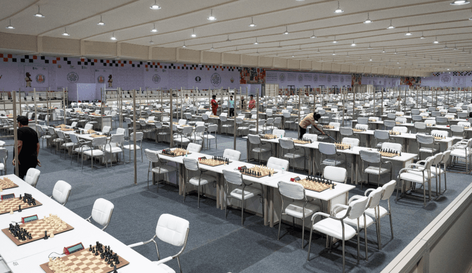 இதையொட்டி, தொடக்க விழாவுக்காக பிரமாண்ட மேடை அமைக்கப்பட்டு வருகிறது. அரங்கில் ஆங்காங்கே பிரமாண்ட செஸ் காய்கள் வைக்கப்பட்டிருக்கின்றன. இதுதவிர ஒலிம்பியாட் போட்டி சின்னமான ‘தம்பி’ உருவ பொம்மைகளும் ஆங்காங்கே வைக்கப்பட்டு இருக்கின்றன.