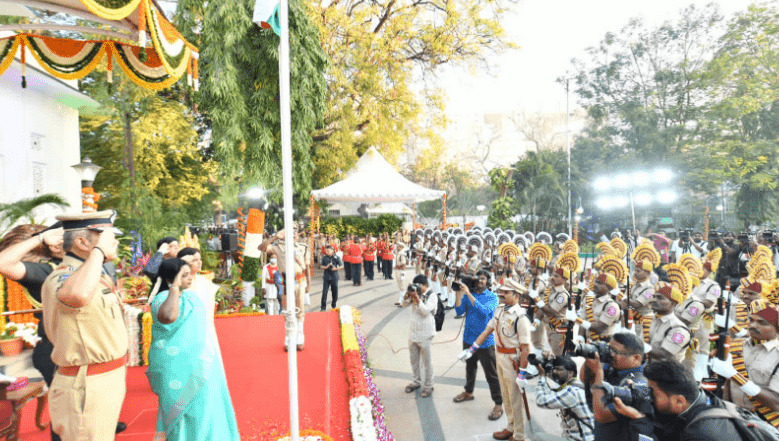 ஐதராபாத்தில் உள்ள ஆளுநர் மாளிகையில் குடியரசு தின விழா கொண்டாட்டத்தையொட்டி அம்மாநில ஆளுநர் தமிழிசை சௌந்தரராஜன் தேசியக்கொடி ஏற்றி வைத்து மரியாதை செலுத்தினார்.