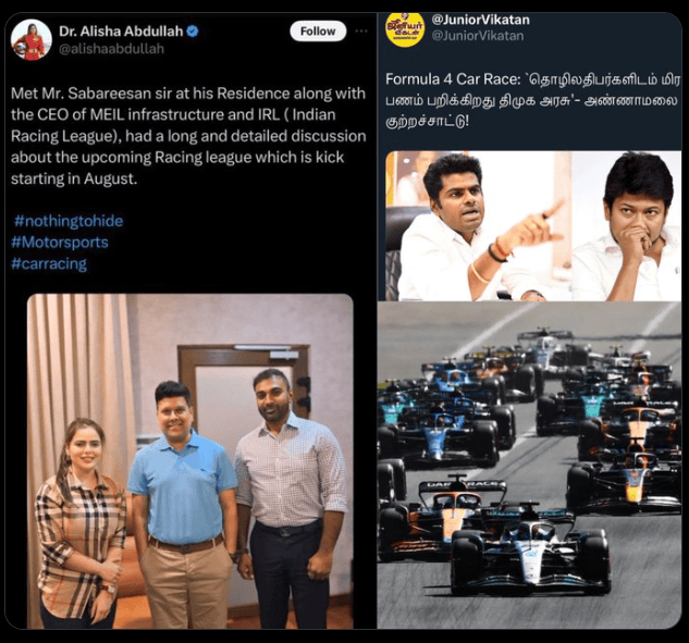 தற்போது ஃபார்முலா ரேசை தமிழ்நாடு அரசு வெற்றிகரமாக நடத்திவிட்டால் மாநில அரசின் விளையாட்டு துறை பெயர் வாங்கிவிடும் என்பதற்காக அபாண்டமாக குற்றம் சாட்டுவது சரியா?