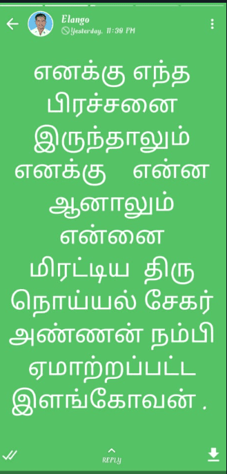 இந்த செய்தியை தற்போது அவரது செல்போனில் வாட்ஸ் ஸ்டேடஸ் ஆகவும் வைத்துள்ளார். தற்போது தற்கொலைக்கு முயற்சித்த இளங்கோவன் மிகவும் ஆபத்தான நிலையில், கோயம்பூத்தூரில் உள்ள கங்கா தனியார் மருத்துவமனையில் தீவிர சிகிச்சை பிரிவில் அனுமதிக்கப்பட்டு சிகிச்சையில் இருந்தார்.