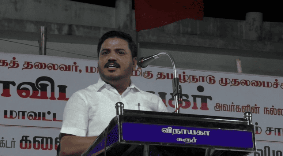 கரூரில் கருணாநிதியின் நூற்றாண்டு விழா பொதுக்கூட்டத்தில் ஐ.டி மற்றும் அமலாக்கத்துறை அதிகாரிகளை வேட்டை நாய் என்றும், கவர்னரை தரக்குறைவான வார்த்தைகளால் திமுக பேச்சாளர் சைதை சாதிக் ஒருமையில் பேசியது பெரும் சர்ச்சையை ஏற்படுத்தியுள்ளது.