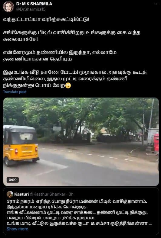 இதற்கு ரிப்ளை செய்த ஷர்மிளா, வந்துட்டாய்யா வரிஞ்சுகட்டிகிட்டு! சங்கிகளுக்கு பிடில் வாசிக்கிறது உங்களுக்கு கை வந்த கலையாச்சே! என்னேரமும் தண்ணியில இருந்தா, எல்லாமே தண்ணியாத்தான் தெரியும்.இது உங்க வீடு தாணே மேடம்! முழங்கால் அளவுக்கு கூடத் தண்ணியில்லை, இதுல முட்டி வரைக்கும் தண்ணி நிக்குதுன்னு பொய் வேற என கஸ்தூரி வீட்டையே வீடியோ எடுத்து போட்டுள்ளார். இருபிரபலங்களின் மோதலுக்கு நெட்டிசன்கள் இருதரப்பினருக்கும் ஆதரவாக எதிராக கமெண்ட் செய்து வருகின்றனர்.