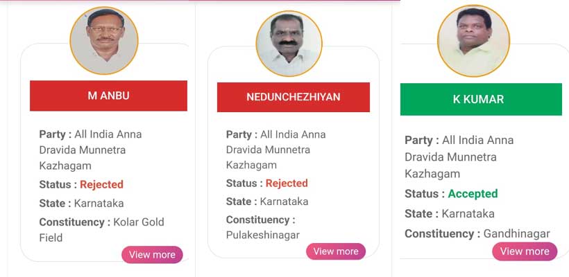 கோலார் தங்க வயல், புலிகேசி நகர் தொகுதிகளில் ஓபிஎஸ் ஆதரவாளர்களின் வேட்பு மனு நிராகரிக்கப்பட்டாலும், காந்தி நகர் தொகுதியில் ஓபிஸ் ஆதரவாளர் கே.குமாரின் வேட்பு மனு ஏற்றுக் கொள்ளப்பட்டிருக்கிறது. அதிலும் கட்சி என்ற இடத்தில் அனைத்து இந்திய அண்ணா திராவிட முன்னேற்ற கழகம் என்றே தேர்தல் ஆணையம்
