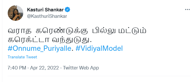 இது குறித்து வெளியிட்டுள்ள ட்விட்டர் பதிவில், வராத கரெண்டுக்கு பில்லு மட்டும் கரெக்ட்டா வந்துதுடுது, ஒண்ணுமே புரியல..விடியல் மாடல் என கடுமையாக சாடியுள்ளார். இவரின் இந்த கருத்துக்கு நெட்டிசன்கள் விமர்சித்து வருகின்றனர்.