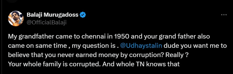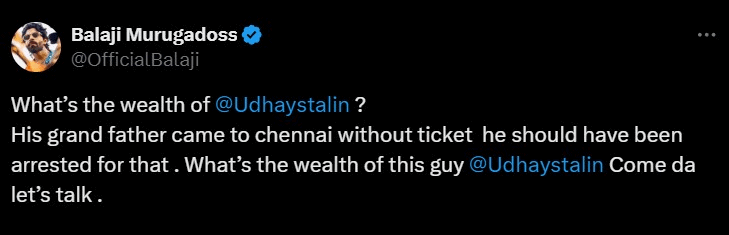 இதனால் கடுப்பான பாலாஜி முருகதாஸ் தற்பொழுது அமைச்சர் உதயநிதி ஸ்டாலின் அவர்களையும் முன்னாள் முதல்வர் கலைஞர் அவர்களை குறித்தும் சர்ச்சைக்குரிய கேள்விகளை கேட்டுள்ளது இணையத்தை சற்று சூடாக்கியுள்ளது. பாலாஜி முருகதாஸ் தனது எக்ஸ் தள பதிவில் ‘உதயநிதி ஸ்டாலினுக்கு எப்படி இவ்வளவு பணம் வந்தது..?அவரது தாத்தா ட்ரெயினில் வித்அவுட் டிக்கெட்டில் வந்ததற்கு கைது செய்திருக்க வேண்டும், இப்படி இருக்க எப்படி உதயநிதி ஸ்டாலினுக்கு இவ்வளவு சொத்து வந்தது!!?? பதில் சொல்லுங்கடா..’ என்று காட்டமாக பதிவிட்டுள்ளார்.