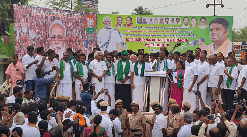 அன்னூரில் தொழில் பூங்கா அமைக்க விவசாய நிலங்களை கையகப்படுத்துவதற்கு எதிர்ப்பு தெரிவித்து பாஜக தலைவர் அண்ணாமலை தலைமையில் ஆர்ப்பாட்டம் நடைபெற்றது.