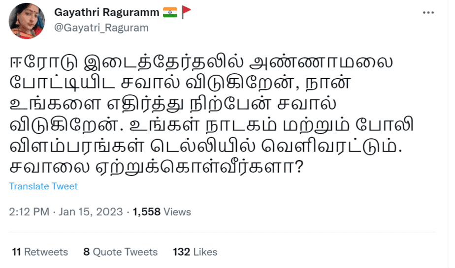இந்த நிலையில் காயத்ரி ரகுராம் வெளியிட்டுள்ள ட்விட்டர் பதிவில், ஈரோடு இடைத்தேர்தலில் அண்ணாமலை போட்டியிட சவால் விடுகிறேன், நான் உங்களை எதிர்த்து நிற்பேன் சவால் விடுகிறேன். உங்கள் நாடகம் மற்றும் போலி விளம்பரங்கள் டெல்லியில் வெளிவரட்டும். சவாலை ஏற்றுக்கொள்வீர்களா? என பதிவிட்டுள்ளார்.