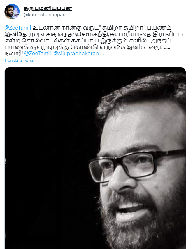 இந்த நிலையில் 4 வருடமாக அந்த நிகழ்ச்சியை நடத்தி வந்த கரு பழனியப்பன், சமூகநீதி,சுயமரியாதை,திராவிடம் என்ற சொல்லாடல்கள் கசப்பாய் இருக்கும் எனில் , அந்தப் பயணத்தை முடிவுக்கு கொண்டு வருவதே இனிதானது! நன்றி என பதவிட்டுள்ளார்.