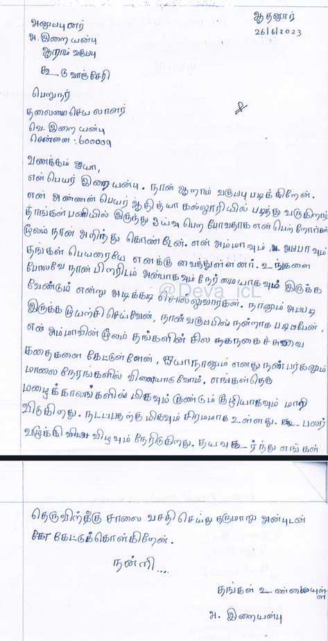 இவ்வாறு அந்த மாணவர் கடிதத்தில் எழுதியுள்ளார். அந்த கடிதத்துடன் மாணவர் இறையன்பு தன் பெயர் பொறிக்கப்பட்ட ஆதார் அடையாள அட்டை நகலையும் இணைத்து அனுப்பி இருந்துள்ளார்.
