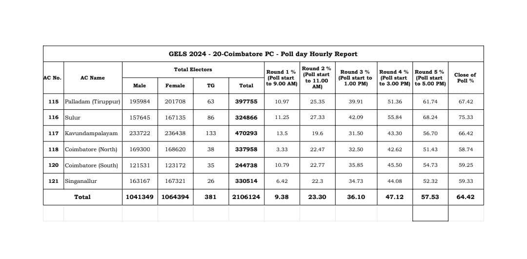 2024 மக்களவைத் தேர்தல் நேற்று காலை 7 மணி முதல் துவங்கி மாலை 6 மணியுடன் நிறைவடைந்தது. கோவை மக்களவைத் தொகுதியிலும் காலை 7 மணி முதல் வாக்குப்பதிவு துவங்கி மாலை 6 மணியுடன் நிறைவடைந்தது. கோவை மக்களவைத் தொகுதியில் 2,059 வாக்குச்சாவடிகளில் நேற்று நடைபெற்ற வாக்குப்பதிவு சதவிகிதம் தற்பொழுது வெளியிடப்பட்டுள்ளது.