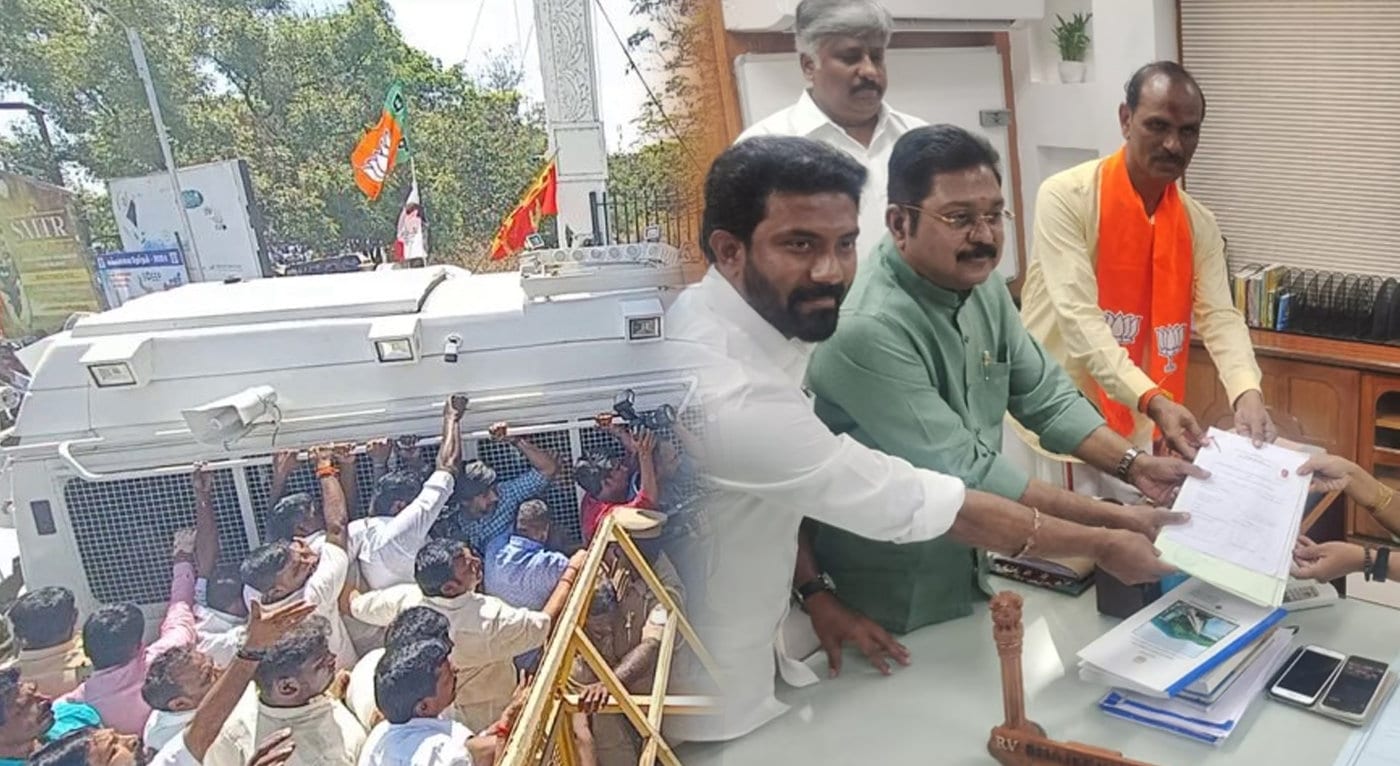 பின்னர், அரை மணி நேர போராட்டத்திற்குப் பிறகு டிடிவி தினகரன் பிரச்சார வாகனம் மற்றும் அவருடன் ஏராளமானோர் போலீசாரின் தடுப்புகளை மீறி உள்ளே சென்று வேட்பு மனுவை தாக்கல் செய்தனர்.