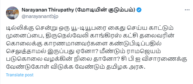 இது குறித்து அவர் தனது X பக்கத்தில், டில்லிக்கு சென்று ஒரு யூ-டியூபரை கைது செய்ய காட்டும் முனைப்பை, திருநெல்வேலி காங்கிரஸ் கட்சி தலைவரின் கொலைக்கு காரணமானவர்களை கண்டுபிடிப்பதில் செலுத்தாமல் இருப்பது ஏனோ?