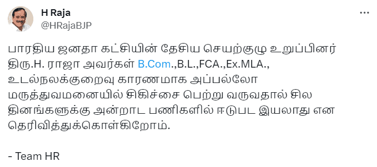 தனது உடல்நலம் பாதிப்பு குறித்து தன்னுடைய எக்ஸ் பக்கத்தில் ஹெச். ராஜாவின் அட்மின் பதிவிட்டுள்ளார். அதில் தனக்கு உடல்நிலை பாதிக்கப்பட்டுள்ளதால் அப்பல்லோ மருத்துவமனையில் அனுமதிக்கப்பட்டுள்ளதாகவும், அதனால் சில தினங்களுக்கு அன்றாட பணிகளில் ஈடுபட முடியாது எனவும் தெரிவிக்கப்பட்டுள்ளது.