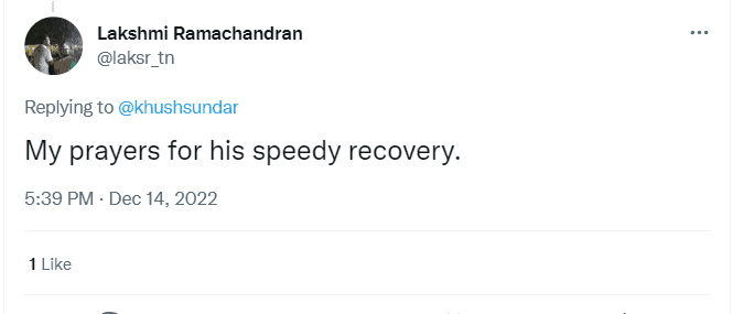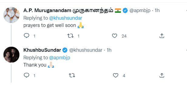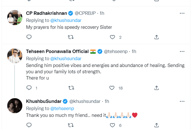 இதையடுத்து அவரது ட்வீட்டுக்கு நெட்டிசன்கள் பலரும், பிரார்த்திப்பதாக கூறி வருகின்றனர். மேலும் பாஜக பிரமுகர்கள் ஏபி முருகானந்தம், சிபி ராதாகிருஷ்ணன், காங்கிரஸ் பிரமுகர் லட்சுமி ராமச்சந்திரன் உள்ளிட்டோரும் வேண்டிக்கொள்வதாக பதில் ட்விட் போட்டுள்ளனர்.