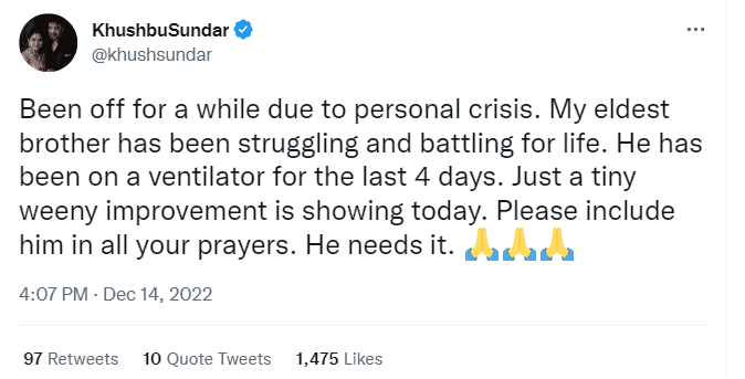 எப்போதும் சமூக வலைதளங்களில் ஆக்டிவ்வாக உள்ள குஷ்பு, கடந்த 4 நாட்களாகவே குஷ்பு எந்த ட்வீட்டும் செய்யாமல் இருந்தார். இந்த நிலையில் தற்போது அவரே ட்விட்டர் பக்கத்தில் பதிவையும் ஒன்றை போட்டுள்ளார்.