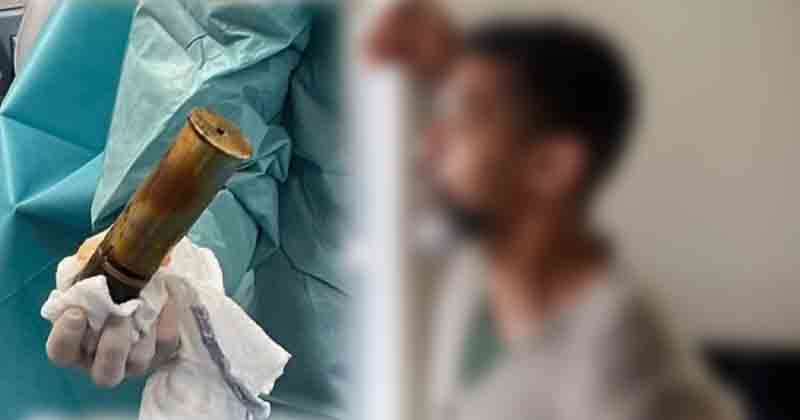 உடனடியாக மருத்துவமனை நிர்வாகம் தேவையான பாதுகாப்பு ஏற்பாடுகளை செய்தது. பின்னர் மருத்துவர்கள், முதியவரின் பின்புறத்தில் இருந்து 20 செ.மீ., நீளம் மற்றும் 2 அங்குல அகலமும் உள்ள வெடிகுண்டை அறுவை சிகிச்சை மூலம் அகற்றினர்.